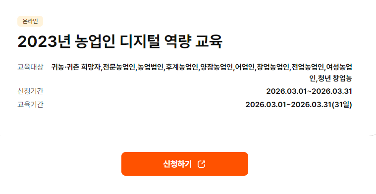 2023년 농업인 디지털 역량 교육 과정은 디지털 기반 농업 환경에 적응할 수 있도록 구성된 프로그램입니다. 교육과정명은 동일하게 운영되며, 2026년에도 같은 명칭으로 신청을 받고 있습니다. 농업 현장에서 실제로 활용 가능한 디지털 기술과 온라인 활용 능력 향상에 초점을 둡니다.